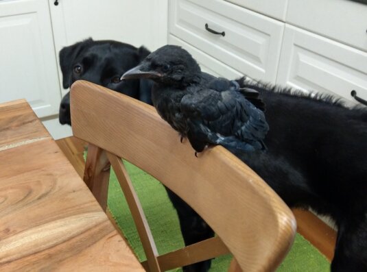 Im Alter von 10 Monaten zog Caruso eine junge Krähe aus dem Gebüsch.